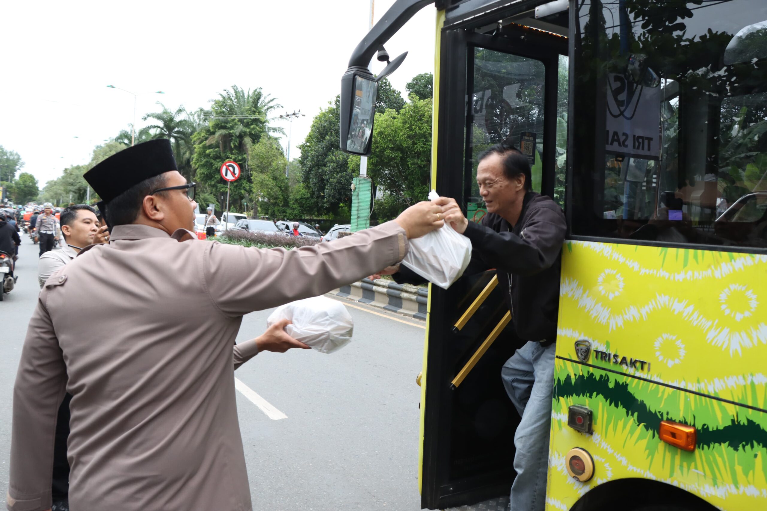 Antusias masyarakat terlihat saat menerima takjil yang dibagikan oleh petugas. Kegiatan berlangsung dengan tertib dan lancar di tengah aktivitas masyarakat menjelang waktu berbuka puasa.