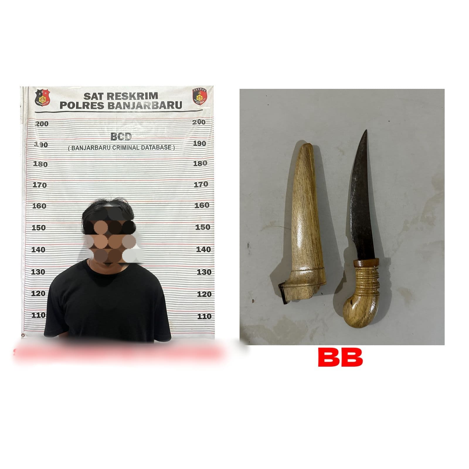 Pelaku berinisial SH (20) diamankan di jalan A.yani km 31 Kecamatan Banjarbaru Selatan, pada Jumat subuh (09/5/2025) sekitar pukul 01.45 WITA. Saat diperiksa, petugas menemukan sebilah pisau yang disimpannya dibagian pinggang sebelah kiri dengan gagang terbuat dari kayu lengkap dengan kumpangnya berwarna coklat muda dengan panjang keseluruhan kurang lebih 21 cm.